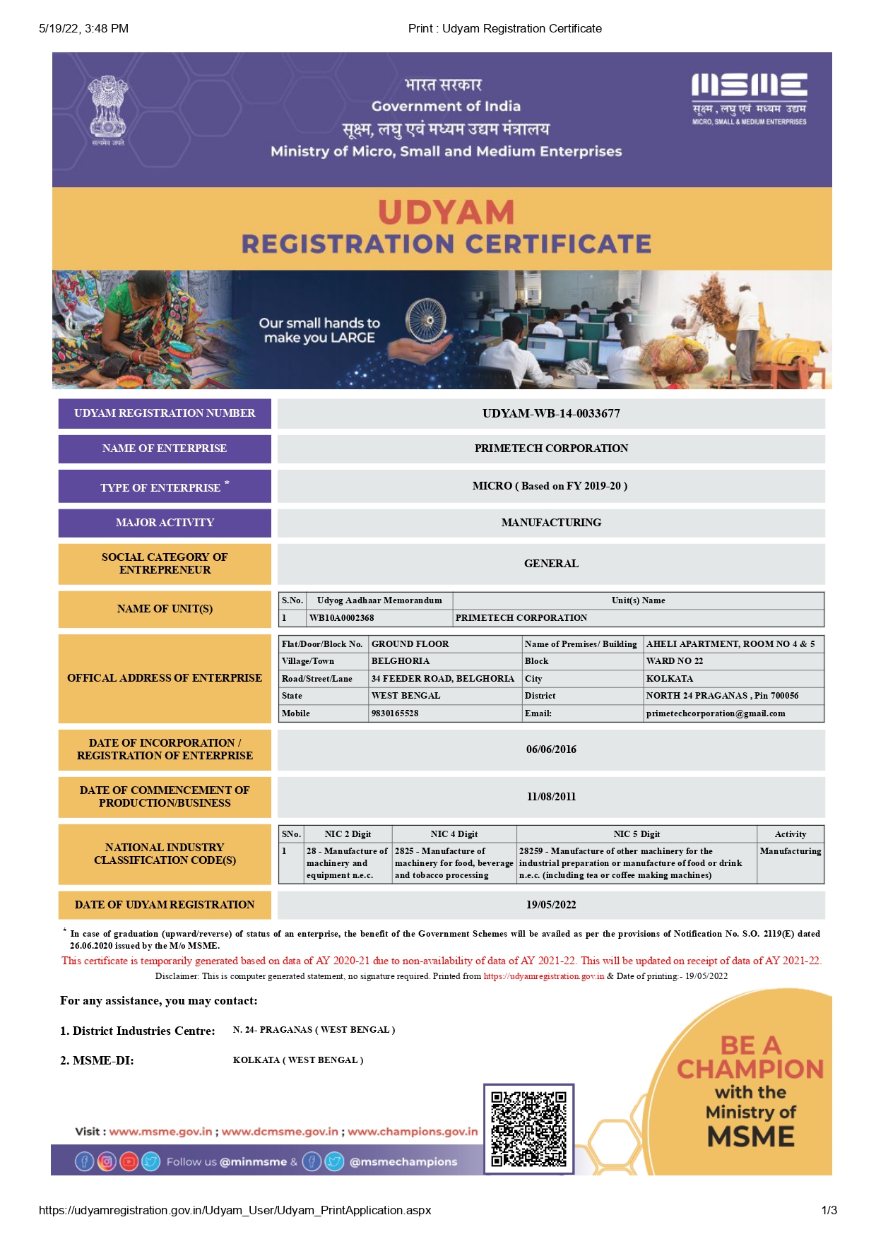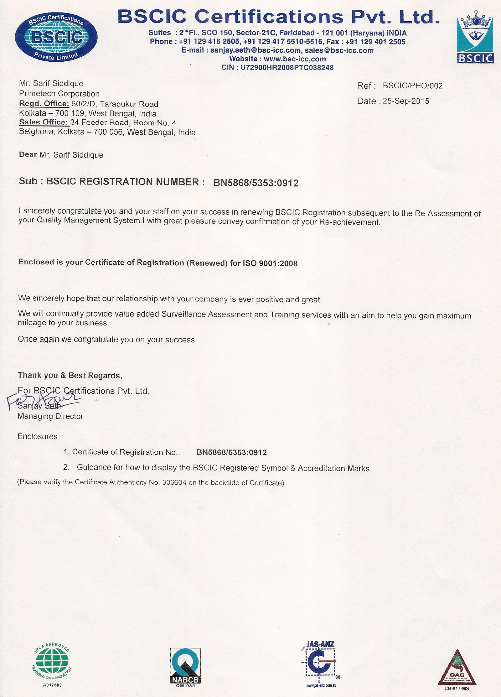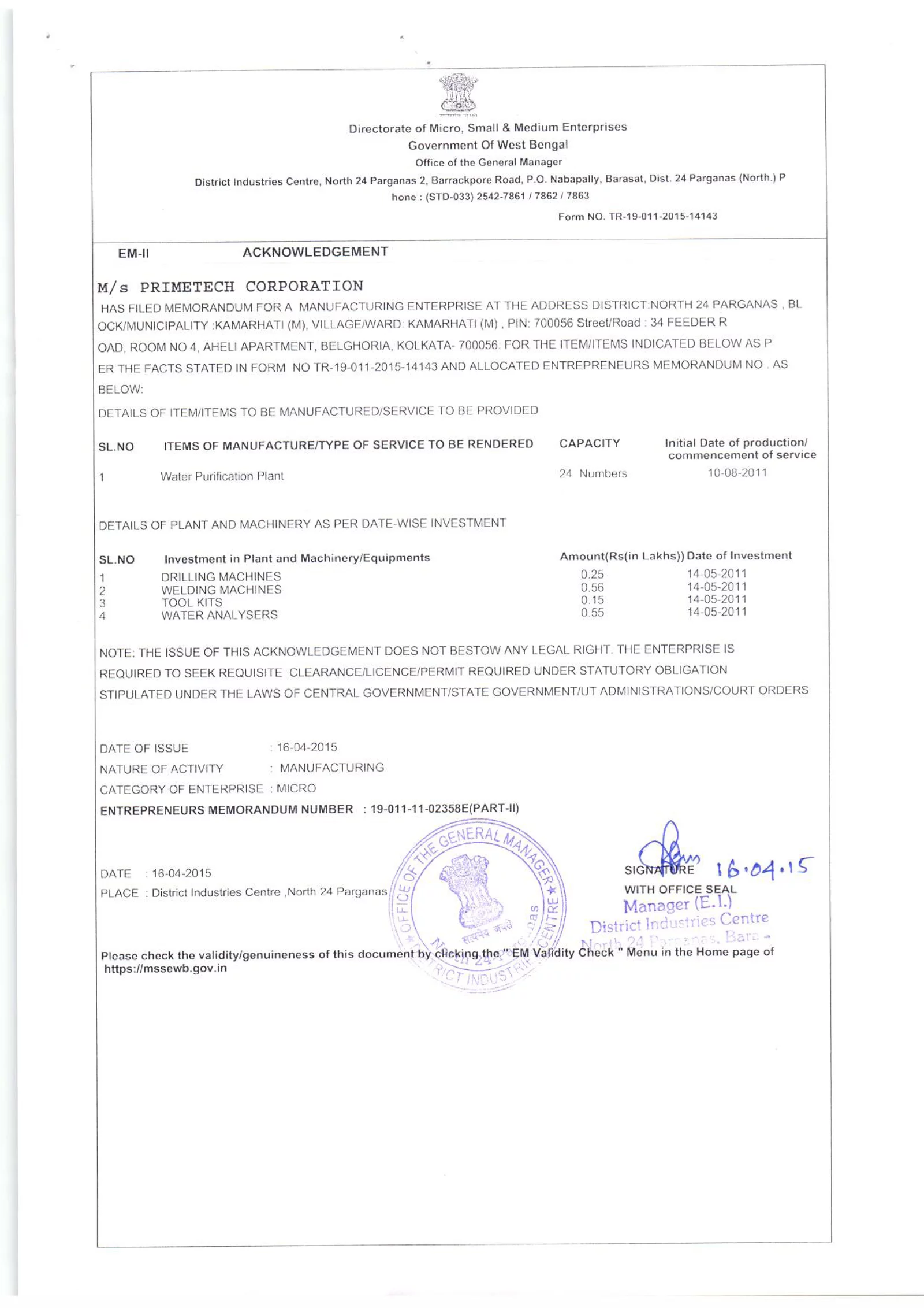 M/s Primetech Corporation (PTC) set up in 2011, is a Company promoted by first generation entrepreneur and professionals with wide in-depth and diversified experience across multiple industries manufacturing products like – FOOD & BEVERAGE INDUSTRIES, viz Packaged Drinking Water (IS:14543:2016), Carbonated Soft Drinks, Club Soda, Flavored Water, Juices, Distilled water, Dairy Products, Country Spirit, IMFL plants etc. ; HEAVY INDUSTRIES, viz Galvanizing units, Aluminium Copper cables, PETROLIUM INDUSTRIES, viz DEF plants.